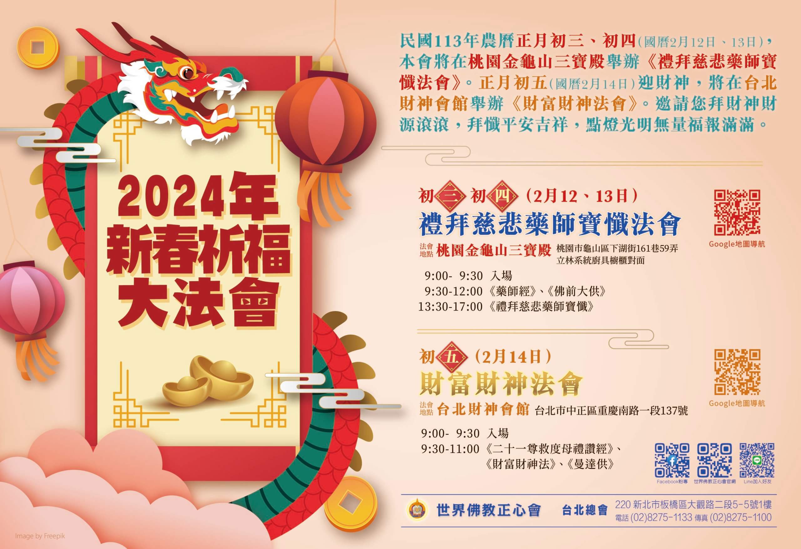 世界佛教正心會將於民國113年農曆正月初三、初四,在桃園金龜山三寶殿舉辦《禮拜慈悲藥師寶懺法會》,正月初五迎財神,於台北財神會館舉辦《財富財神法會》,法會期間恭請 指導金剛上師恆性嘉措仁波且,為世界佛教教皇 南無第三世多杰羌佛在台弘法弟子,陞座主法,邀請善信大眾禮拜財神財源滾滾,拜懺平安吉祥,點燈光明無量福報滿滿。